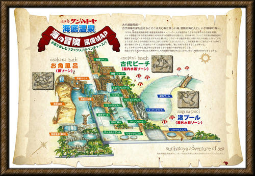 裸ゾーン「お魚風呂」、屋内水着ゾーン「古代ビーチ」、   屋外水着ゾーン「渚ビーチ」(夏期限定)からなる、温泉アミューズメント施設です。